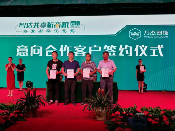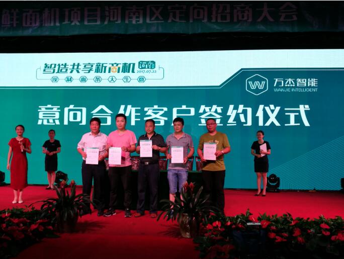 7月22日,智造共享新商機(jī),萬(wàn)杰智能鮮面機(jī)河南大區(qū)定向招商大會(huì)在許昌成功落下帷幕。超過(guò)70家意向合伙人(170余人)齊聚本次招募大會(huì),當(dāng)天有30余家意向合伙人簽訂合作意向書(shū)。