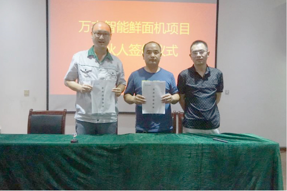 2017年8月10日,河南省周口市偉萍商貿有限公司王總河北省邢臺市老城府食品有限公司于總分別與萬杰智能簽訂《智能鮮面機合伙人合作協議》,正式成為萬杰智能鮮面機在周口市、邢臺市的合伙人。至此簽約設備數量已突破了2000臺,萬杰智能鮮面機的第一階段招商工作取得了階段性成果截止2017年8月11日(本周五)18:00后,萬杰智能暫緩簽約工作,歡迎各位伙伴繼續蒞臨萬杰參觀考察!