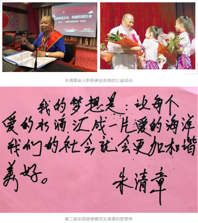 朱清章老人自 2011 年 9 月 20 日,在第三屆全國道德模范評選活動中榮獲 全國孝老愛親模范稱號,獲得殊榮以來,他受邀無償地參加各地的公益活動。他 經常到各轄區學校、社區進行義務宣講,傳遞正能量,弘揚孝老愛親、無私奉獻 的時代精神。